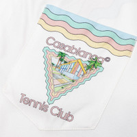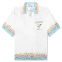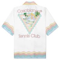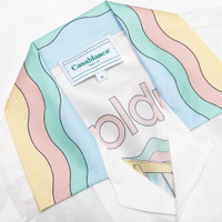 The Maison De Reve Twill Shirt is crafted from pure silk with a satin finish. It features a multicolor design on the collar and sleeves, adding a cool touch to its design. The camp collar and concealed front button fastening offer a clean, sophisticated look, complemented by short sleeves and a chest patch pocket. - 100% Silk - Satin finish - Camp collar - Design on collar and sleeves - Concealed front button fastening - Screen printed design on chest and back - Short sleeves - Chest patch pocket - Style No: U-MPF24-SH-003-02