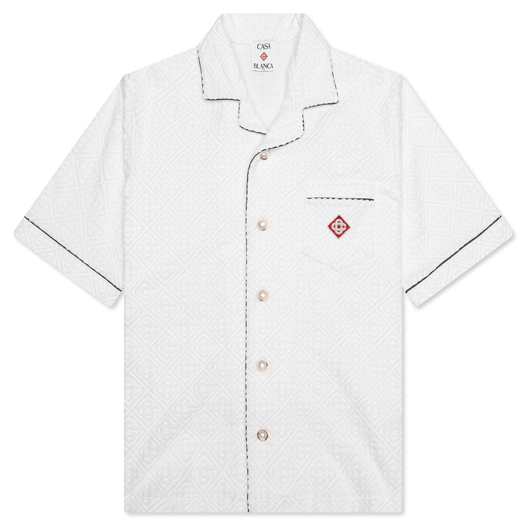The Open Collar Shirt in Off White combines classic styling with elevated details. Crafted from a cotton, nylon, and elastane blend, this camp shirt features a monogram toweling jacquard construction for a unique texture. Multicolor piping and a notched collar add a touch of refinement, while pearly buttons and a chest patch pocket with a monogram patch complete the design. - Cotton/nylon/elastane - Camp shirt in monogram toweling jacquard - Multicolor piping - Notched collar - Pearly button closure - Chest patch pocket - Monogram patch at pocket - Style No: U-MPS25-SH-085-02