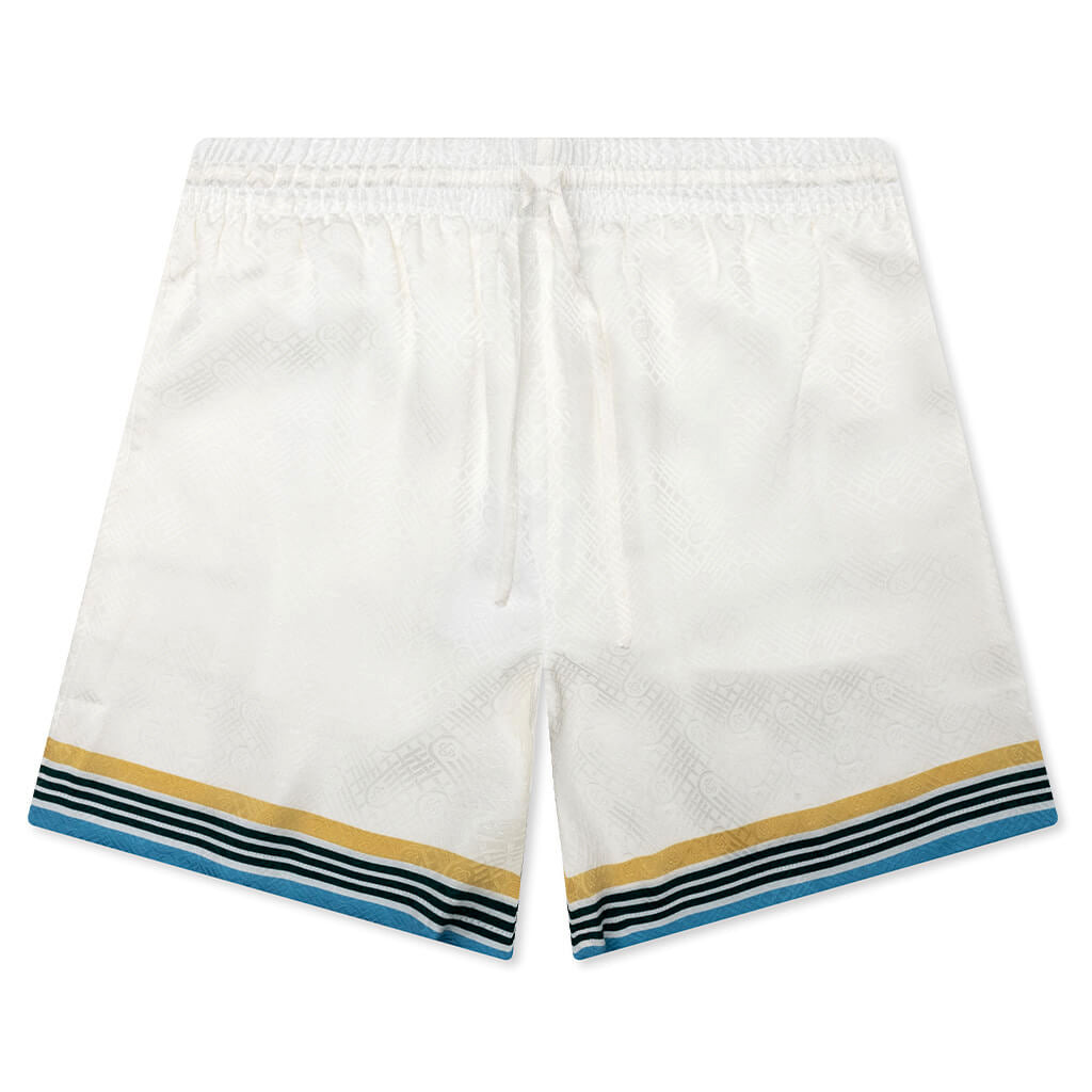 Resort-style luxury brand Casablanca presents their Silk Shorts With Drawstrings for an Italian summer-inspired leisure short. Made with striped hems and a back pocket, featuring an original graphic. - Side slip pockets - Relaxed legs - Elasticized drawstring waist - Style No: MPS24-TR-012-02