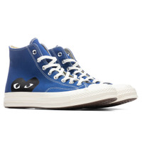 The iconic partnership of Converse and Comme Des Garcons PLAY is highlighted in their All Star Chuck ‘70 High sneaker model. The model features the iconic red heart logo designed by artist Filip Pagowski as well as a signature canvas upper and lace-up closure. Complete with a rubber toebox and outsole, the sneaker provides a long-lasting finish. CHUCK TAYLORS RUN ABOUT 1/2 SIZE LARGE, WE RECOMMEND SIZING DOWN. DUE TO THE LIMITED NATURE OF THIS PRODUCT, ALL SALES ARE FINAL. - 12 oz cotton canvas upper - Rubber outsole - Printed imagery - Tonal stitching - Cotton laces - Perforated details - All sizes are listed in U.S. Men’s sizing unless stated otherwise - Style no: 171846C