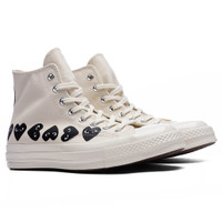 The newest collaboration between Converse and Comme Des Garcons PLAY continues with the All Star Chuck ‘70 Hi. The traditional Converse silhouette features the signature bug-eyed red heart motif throughout the exterior. The silhouette is complete with a full-lace closure, and a rubber toe box and outsole for extended durability. CHUCK TAYLORS RUN ABOUT 1/2 SIZE LARGE, WE RECOMMEND SIZING DOWN. A08148C - Canvas upper - Printed CDG heart logos - Rubber outsole - This product is excluded from all discounts and special promotions - All sizes are listed in U.S. Men's sizing unless stated otherwise - Style No: A08148C