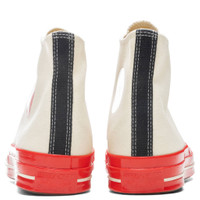 Converse continues its 12-year-long partnership with Comme des Garcons PLAY in a forward-thinking silhouette. The reimagined Chuck ‘70 silhouette is introduced in a ‘Red Sole’ colorway. The premium canvas upper is stamped with an iconic Chuck Taylor patch at the ankle, while the other sports an iconic bug-eyed red heart motif in honor of Comme des Garcons PLAY’s rich heritage. The shiny bright red midsole is treated with a contrasting pinstripe, making a distinct statement in its entirety. The detailed stitching placed throughout emphasizes a vintage aesthetic, while the rubber outsole underneath ties together the rest of the design. CHUCK TAYLORS RUN ABOUT 1/2 SIZE LARGE, WE RECOMMEND SIZING DOWN. DUE TO THE LIMITED NATURE OF THIS PRODUCT, ALL SALES ARE FINAL. - Canvas upper - High-top design - Detailed stitching - Metal eyelets - Chuck Taylor patch - Screen-printed motif - Glossy red midsole - Contrasting pinstripe - Rubber outsole - All sizes are listed in U.S. Men’s sizing unless stated otherwise - Style No: A01794C