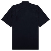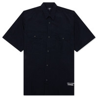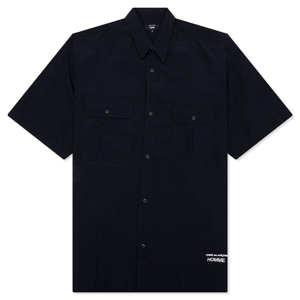 The Comme Des Garcons Homme Curved Hem Nylon Short Sleeve Shirt is crafted from 100% nylon with a light yet sturdy feel, offering both durability and comfort. Designed with a classic collar and button-down closure, this short-sleeve shirt features two front flap pockets with button closures, a Velcro pocket compartment with elastic attachment to hook, and embroidered branding at the hem. A curved hem, single side pleats on the back, and a boxy fit complete the utilitarian-inspired silhouette. - 100% Nylon with a light, sturdy feel - Classic collar - Button-down closure - Two front flap pockets with button closures - Velcro pocket compartment with elastic attachment to hook - Embroidered branding at bottom - Curved hem - Short sleeves - Single side pleats on back - Boxy fit - Style No: HO-B024-S25-2