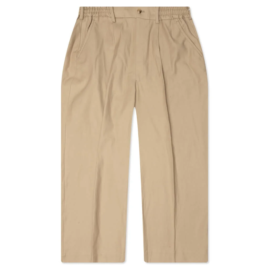 The Double Weave Pant in beige is crafted from soft cotton for all-day comfort. It features a partially elasticized waistband with a concealed drawstring and belt loops for a versatile fit. The design includes four-pocket styling, a zip-fly, and refined knife pleats at the front, adding a touch of structure to the creased legs. - 100% Cotton - Belt loops - Concealed drawstring at partially elasticized waistband - Four-pocket styling - Zip-fly - Knife pleats at front - Creased legs - Style No: HN-P009-051-2