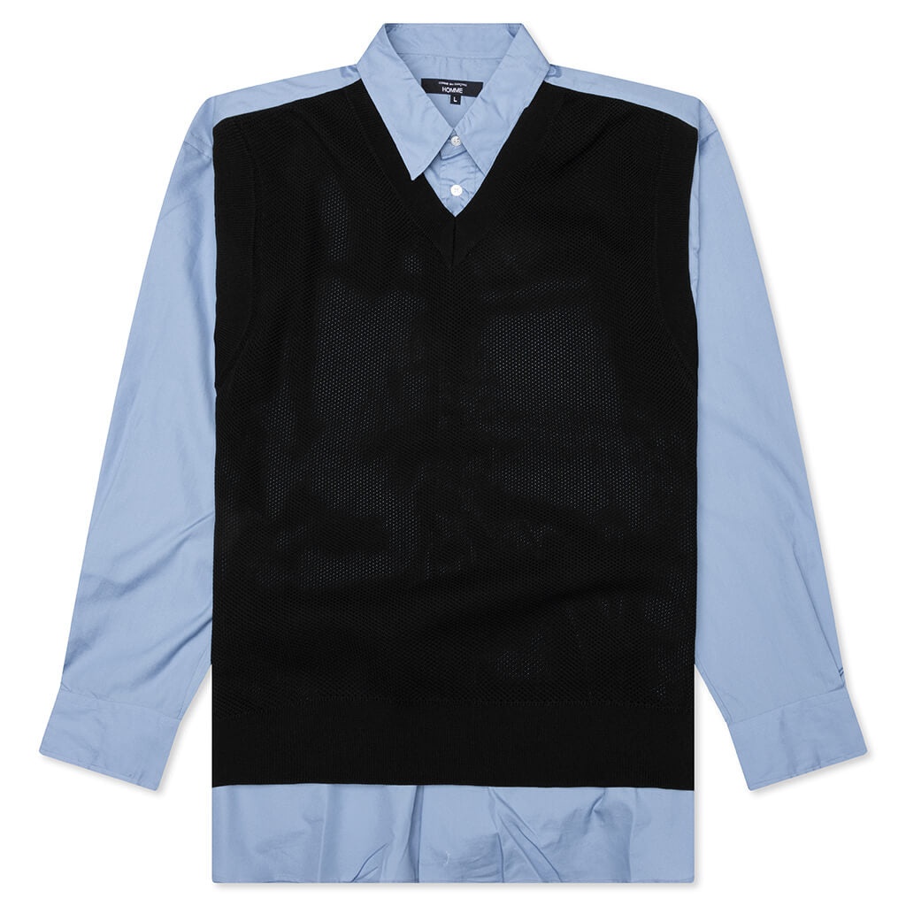 The Mixed Material Shirt from Comme des Garcons Homme offers a unique two-in-one silhouette. Crafted from 100% cotton for the main body with an attached 100% polyester vest overlay, it delivers the look of layered styling with the ease of a single piece. The shirt features a standard collar, full button front, and long sleeves with adjustable arm cuffs. - Main: 100% Cotton - Attached Fabric: 100% Polyester - Button up shirt with vest silhouette - Standard collar - Button front - Adjustable arm cuffs - Long sleeve - Style No: HO-B010-051-1