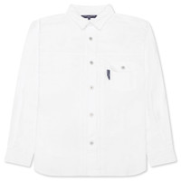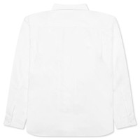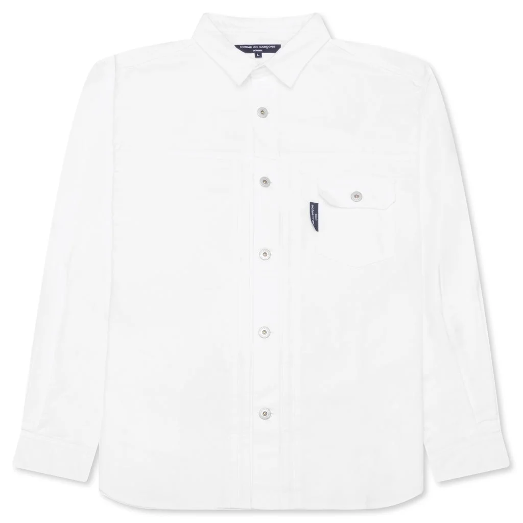 The Striped Shirt in White from Comme Des Garcons Homme is crafted from cotton and features a spread collar with a button closure for a classic look. It includes a patch pocket and a shirttail hem for added style, while single-button barrel cuffs provide a refined finish. The box pleat at the back yoke enhances comfort and movement, making this shirt a versatile addition to any wardrobe. - 100% Cotton - Spread collar - Button closure - Patch pocket - Shirttail hem - Single-button barrel cuffs - Box pleat at back yoke - Style No: HN-B018-051-2
