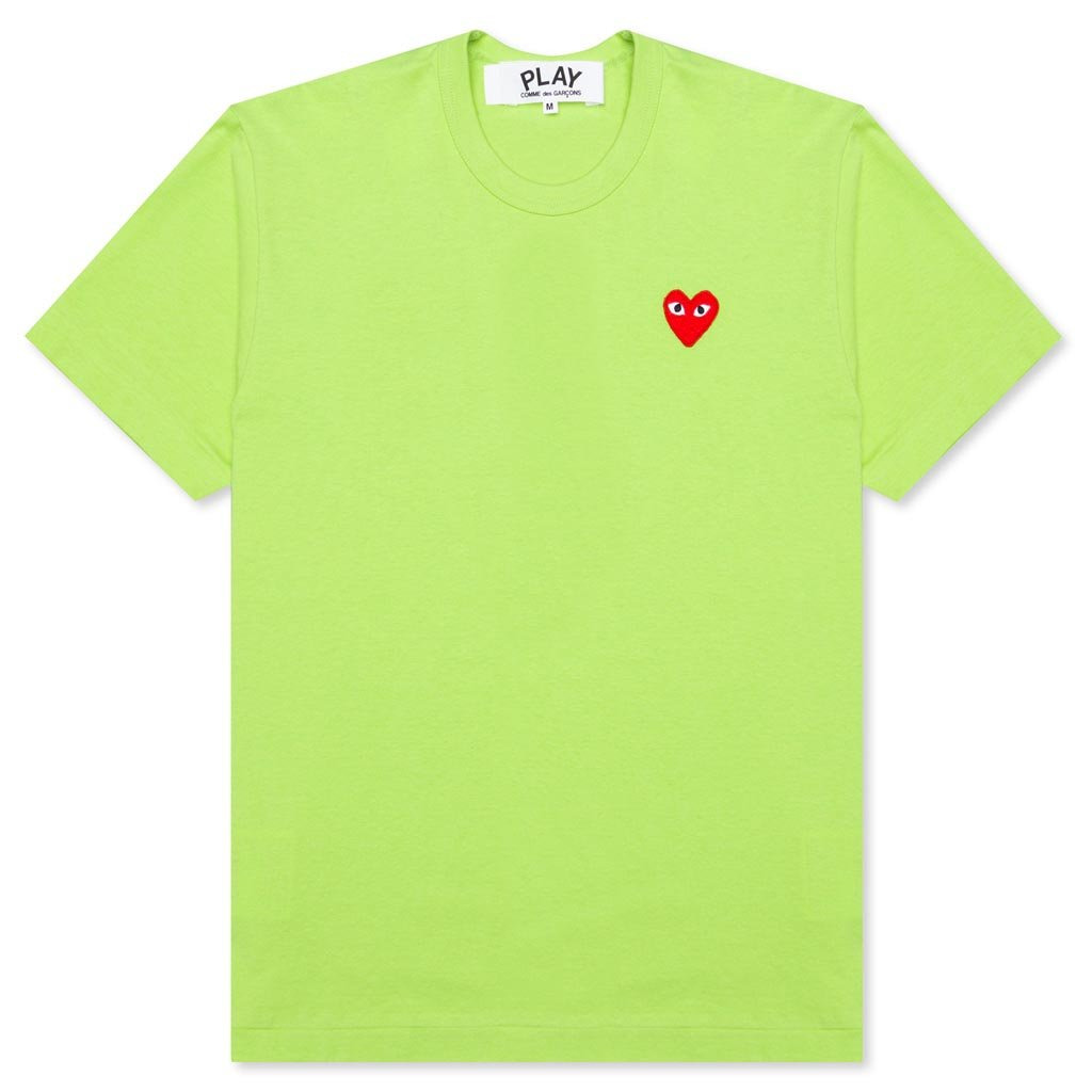 The concept of the Comme des Garcons PLAY line is design by not designing. Characterized by the iconic red heart logo designed by artist Filip Pagowski, the line is a collection of unisex basics, fragrances, and footwear. Pictured is the Comme des Garcons PLAY Pastelle Red Emblem T-Shirt in Green. AZ T272 051 2 COMME DES GARCONS PLAY APPAREL HAS A SMALLER FIT, WE RECOMMEND SIZING UP. condition: new - 100% Cotton - Printed branding - Ribbed trims - Made in Japan - Style no: AZ-T272-051-2