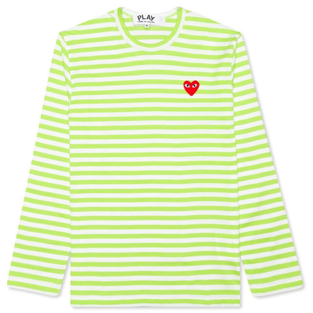 The concept of the Comme des Garcons PLAY line is design by not designing. Characterized by the iconic red heart logo designed by artist Filip Pagowski, the line is a collection of unisex basics, fragrances, and footwear for those who enjoy simplicity. Pictured is the Comme des Garcons PLAY Pastelle Women's Striped L/S Shirt in Green. AZ T277 051 2 COMME DES GARCONS PLAY APPAREL HAS A SMALLER FIT, WE RECOMMEND SIZING UP. condition: new - 100% Cotton - Ribbed collar - Embroidered branding - Made in Japan - Style no: AZ-T277-051-2