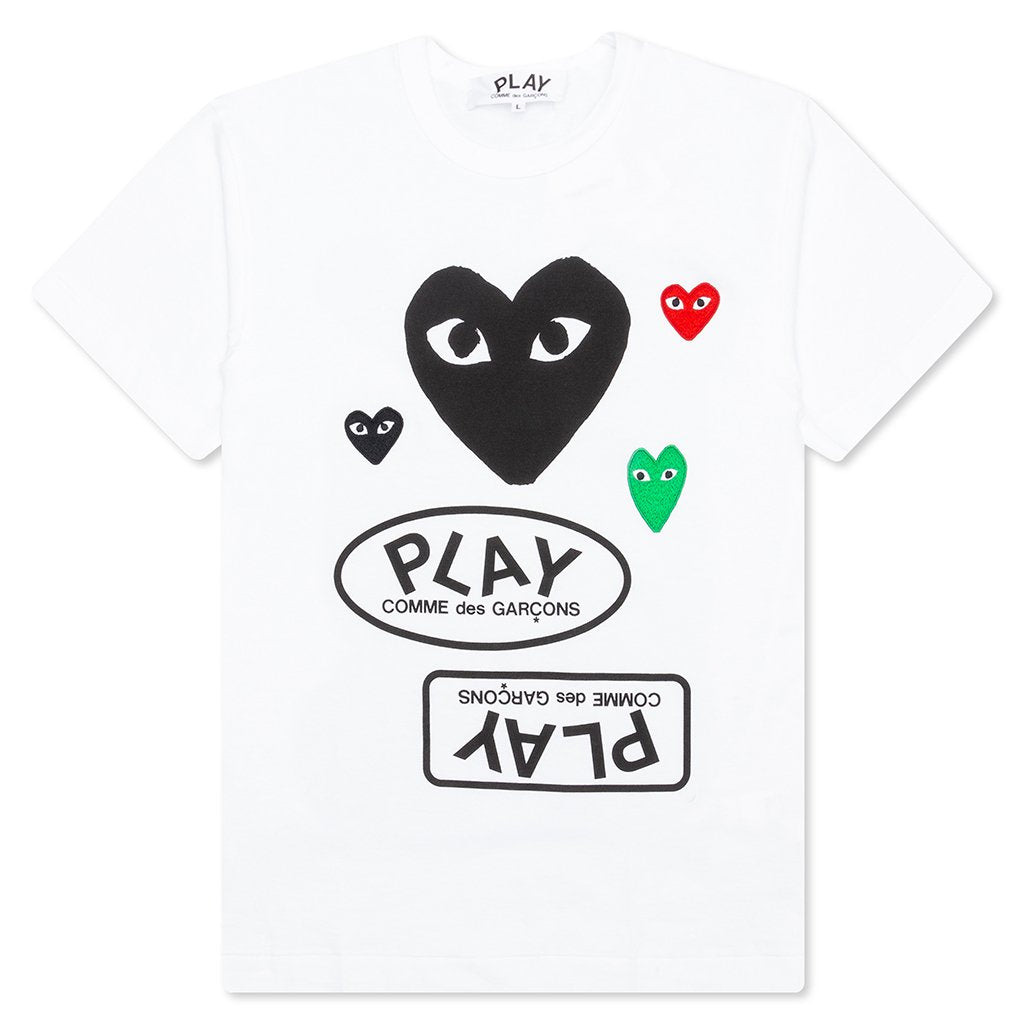 The concept of the Comme des Garcons PLAY line is design by not designing. Characterized by the iconic red heart logo designed by artist Filip Pagowski, the line is a collection of unisex basics, fragrances, and footwear for those who enjoy simplicity. Pictured is the Comme des Garcons PLAY Women's Black Multi Logo S/S T-Shirt in White. AZ T281 051 1 COMME DES GARCONS PLAY APPAREL HAS A SMALLER FIT, WE RECOMMEND SIZING UP. condition: new - 100% Cotton - Ribbed crewneck - Embroidered branding - Printed graphics - Made in Japan - Style no: AZ-T281-051-1