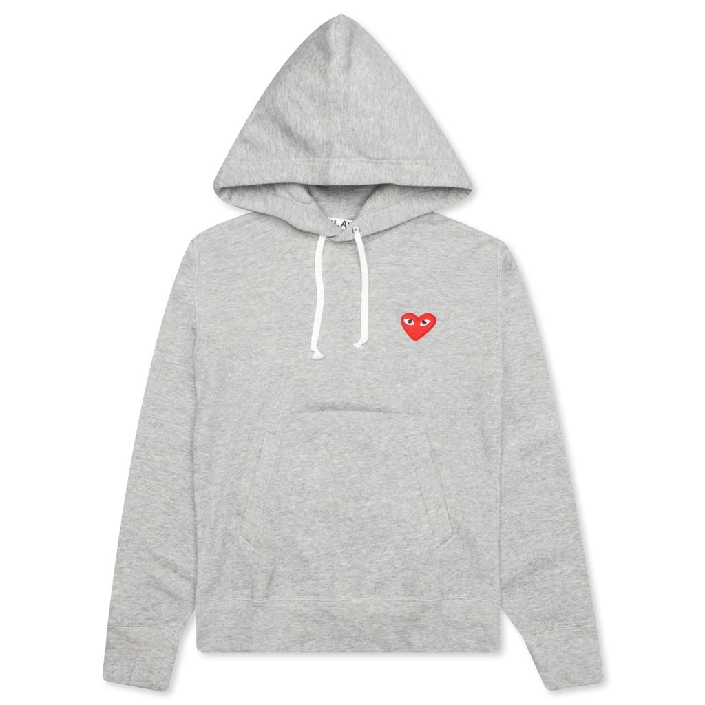 The concept of the Comme des Garcons PLAY line is design by not designing. Characterized by the iconic red heart logo designed by artist Filip Pagowski, the line is a collection of unisex basics, fragrances, and footwear for those who enjoy simplicity. Pictured is the Comme des Garcons PLAY Women's Hoodie in Grey. COMME DES GARCONS PLAY APPAREL HAS A SMALLER FIT, WE RECOMMEND SIZING UP. condition: new - 100% Cotton - Ribbed cuffs and hem - Kangaroo pocket - Embroidered CDG heart logo - Style no: AZ-T169-051-1