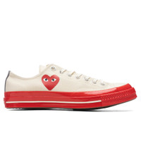 Converse continues its 12-year-long partnership with Comme des Garcons PLAY in a forward-thinking silhouette. The reimagined Chuck ‘70 silhouette is introduced in a ‘Red Sole’ colorway. The premium canvas upper is stamped with an iconic Chuck Taylor patch at the ankle, while the other sports an iconic bug-eyed red heart motif in honor of Comme des Garcons PLAY’s rich heritage. The shiny bright red midsole is treated with a contrasting pinstripe, making a distinct statement in its entirety. The detailed stitching placed throughout emphasizes a vintage aesthetic, while the rubber outsole underneath ties together the rest of the design. CHUCK TAYLORS RUN ABOUT 1/2 SIZE LARGE, WE RECOMMEND SIZING DOWN. DUE TO THE LIMITED NATURE OF THIS PRODUCT, ALL SALES ARE FINAL. - Canvas upper - High-top design - Detailed stitching - Metal eyelets - Chuck Taylor patch - Screen-printed motif - Glossy red midsole - Contrasting pinstripe - Rubber outsole - All sizes are listed in U.S. Men’s sizing unless stated otherwise - Style No: A01796C