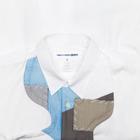 Comme des Garcons SHIRT, a Men's sub-label of Comme des Garcons, was launched by the brand's creator Rei Kawakubo in 1988. The label is renowned for its avant garde aesthetic and unconventional silhouettes which feature a mix of cutting-edge tailoring combined with classical elements such as lively colors and art-inspired prints. Pictured is the Comme Des Garcons SHIRT Mens Woven in White/Dark Grey. FINAL SALE ITEM. NOT ELIGIBLE FOR RETURNS/CANCELLATIONS. - 100% Cotton - Patchwork details - Curved hem - Made in France - All sizes are listed in U.S. Men's sizing unless stated otherwise - Style no: W27032-1