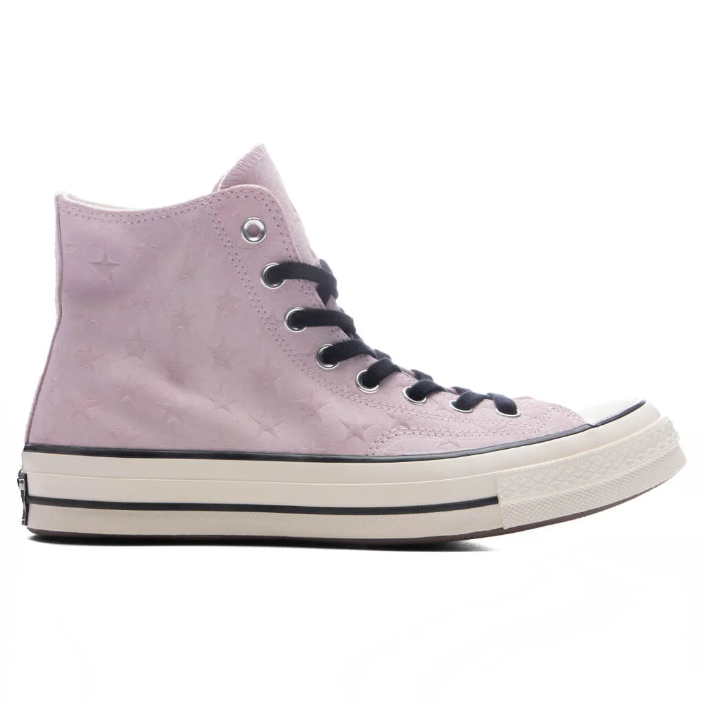 Converse is an American footwear brand rooted in basketball heritage, known for its iconic silhouettes and continued innovation in sport and style. The Converse Chuck 70 Hi Stars is a lifestyle high-top sneaker constructed with a suede upper with debossed stars. Heritage details including a leather Chuck Taylor patch and All Star license plate maintain its classic identity. A thick rubber outsole completes the build with reliable traction and everyday wearability. - Brand: Converse - Model: Chuck 70 Hi Stars - Category: Lifestyle high-top sneaker - Colorway: New Found Bloom / Egret / Black - Upper Material: Suede upper with debossed stars - Cushioning: OrthoLite® - Midsole: Varnished rubber midsole - Outsole: Thick rubber outsole - Closure: Lace-up - Branding: Leather Chuck Taylor patch and All Star license plate - Sizing: All sizes listed in U.S. Men's unless stated otherwise - Style Code: A15981C
