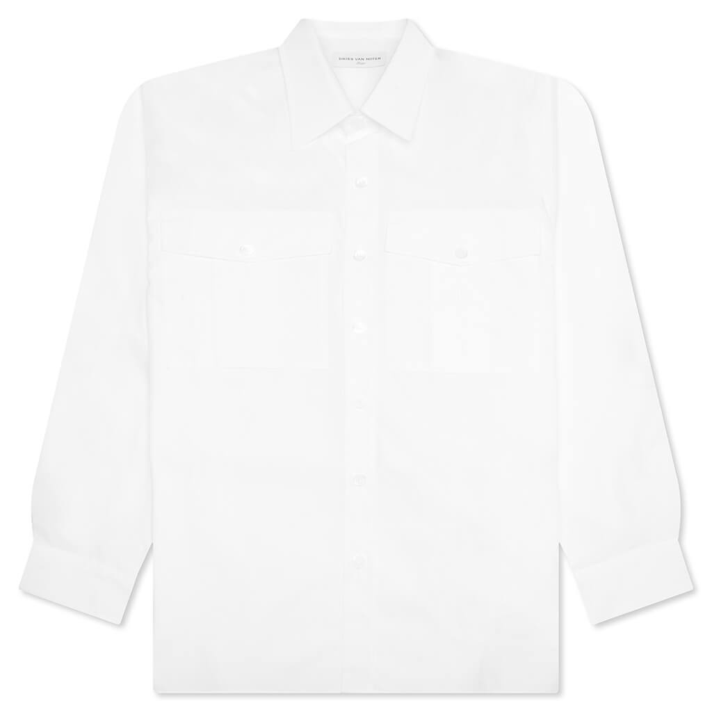 The Cornish 9293 M.W. Shirt in White is crafted from cotton poplin, offering a crisp and breathable feel. Designed with an oversized fit, it features chest cargo pockets for added utility, buttoned cuffs, and a front button closure for a structured finish. - 100% Cotton Poplin - Oversized fit - Chest cargo pockets - Buttoned cuffs - Front button closure - Style No: 020731-9293-001