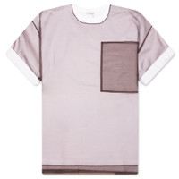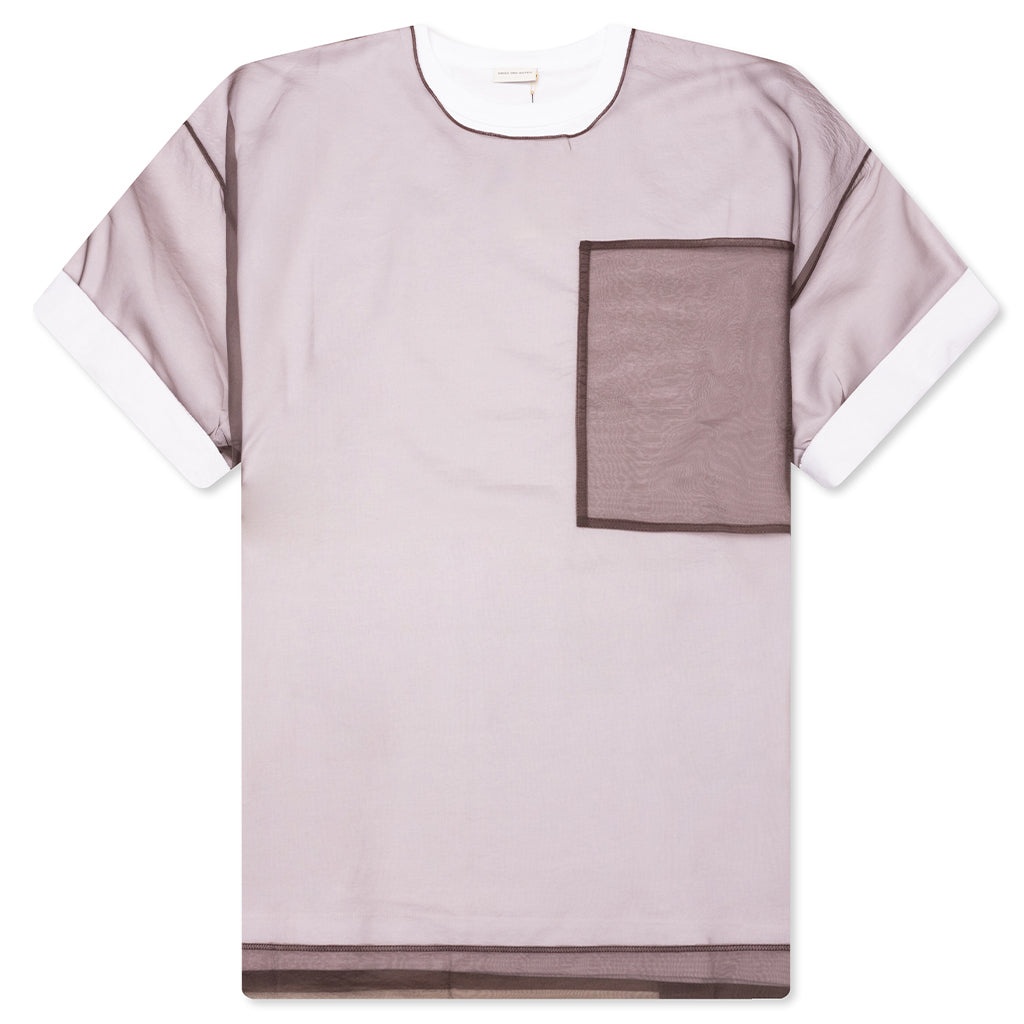 Dries Van Noten presents the Heaton 1603 M.K. S/S T-Shirt. Crafted from a soft, breathable cotton and polyester blend, it features a white base tee layered beneath a dark grey sheer overlay for a dimensional look. The drop shoulder design and relaxed fit offer a laid-back silhouette, complemented by a clean crew neckline and front chest pocket. - 50% Cotton, 50% Polyester - Sheer overlay - Crew neckline - Front chest pocket - Drop shoulder design - Style No: 251-021120-1603-1