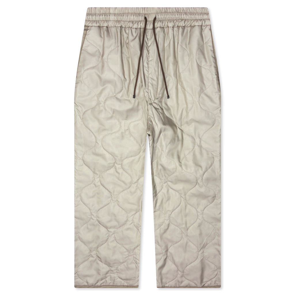 The Pleaded Padded Pants in Sand, are quilted ripstop pants designed for both style and functionality. Featuring side slit pockets and a back zip pocket, and an elasticated waistband with a drawstring for a customized fit and maximum comfort. - 69% Nylon, 31% Polyester - Side slit pockets & back zip pocket - Elasticated waistband with drawstring - Quilted Nylon - Water Repellant - Style No: 241-020956-8502-101