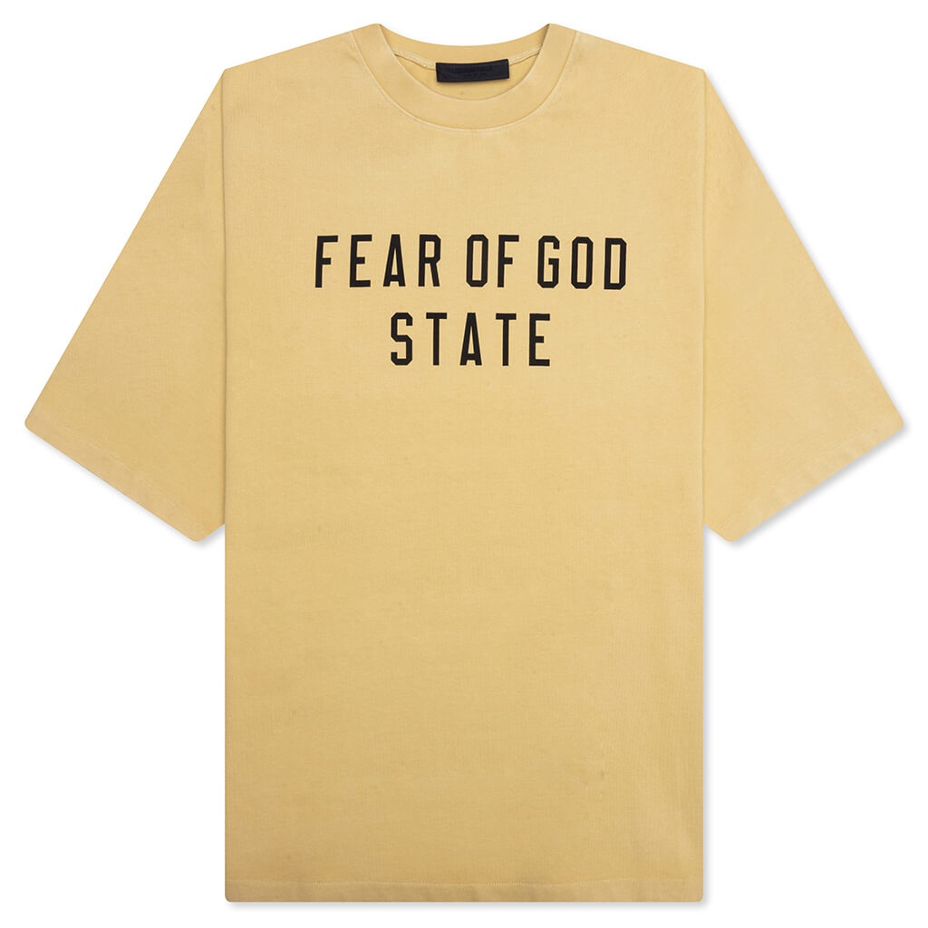 The Heavy Crewneck Tee from Fear of God Essentials is elevated in a 380-gram heavy cotton jersey to provide pronounced weight and structure. The rib-knit crewneck tee fits relaxed in the body with dropped shoulders. A collegiate-inspired "Fear of God State" graphic is screen printed on the center front, and the Essentials Fear of God rubberized label is at the back collar. ALL SALES ARE FINAL. - 100% Cotton - Essentials fit - Relaxed body and sleeves - Screen-printed branding - Ribbed crewneck - Rubberized label - Style No: 125BT242003F