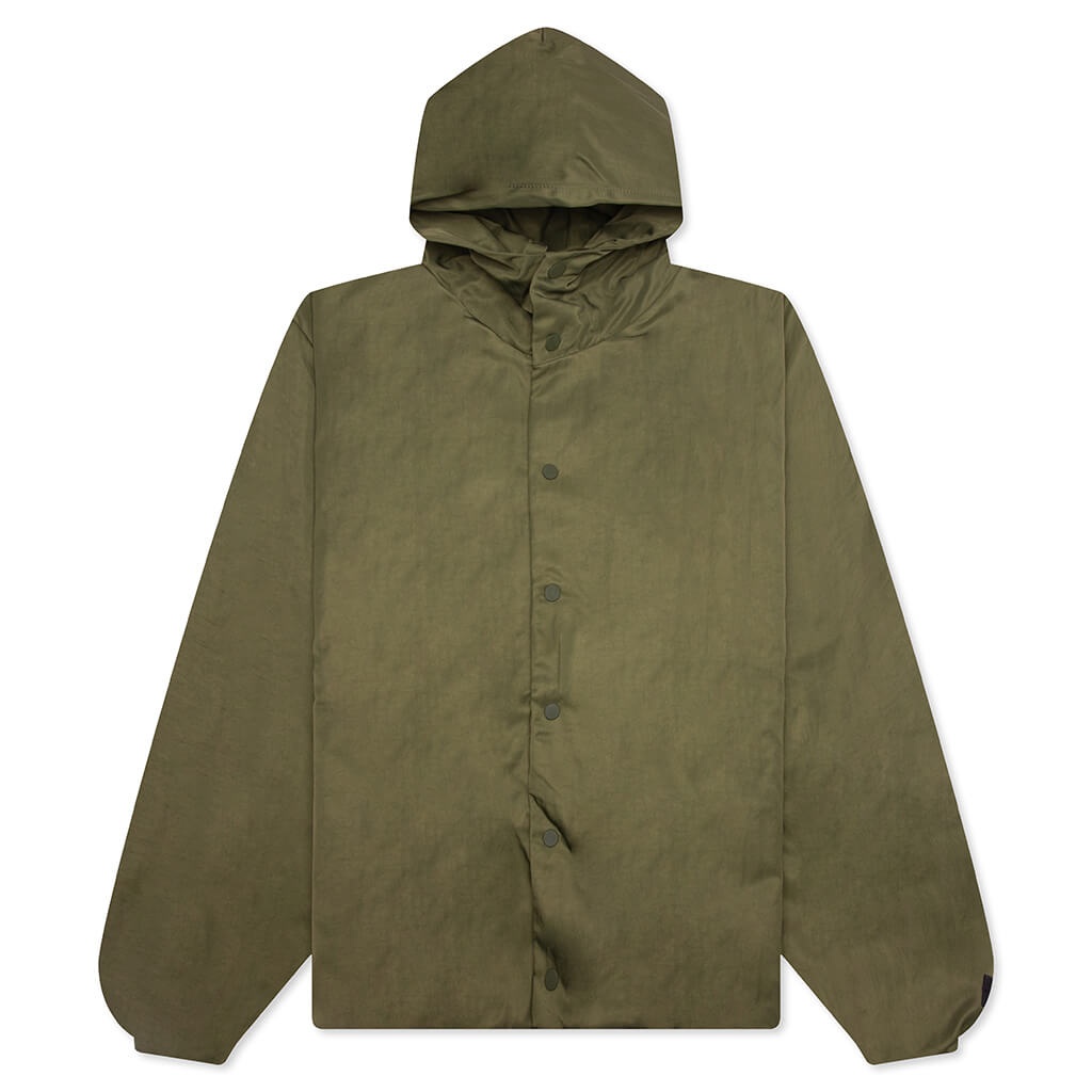 The Textured Nylon Hooded Coaches Jacket in Military is crafted from recycled nylon with a perforated polyester lining for breathability. Showcasing "Fear of God Essentials" satin twill lettering across the back, this piece offers a modern yet timeless design. Functional details include full-front rubber snaps, side pockets, a drawstring waist, and elastic hem cuffs for a secure fit. Finished with the signature Essentials Fear of God rubberized label, it blends sustainable materials with elevated style. - Recycled nylon construction - Polyester perforated lining - "Fear of God Essentials" satin twill lettering - Full-front rubber snaps - Side pockets - Drawstring waist - Elastic hem cuffs - Essentials Fear of God rubberized label - Style No: 202BT246375F