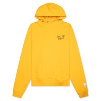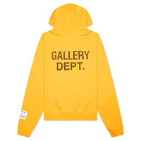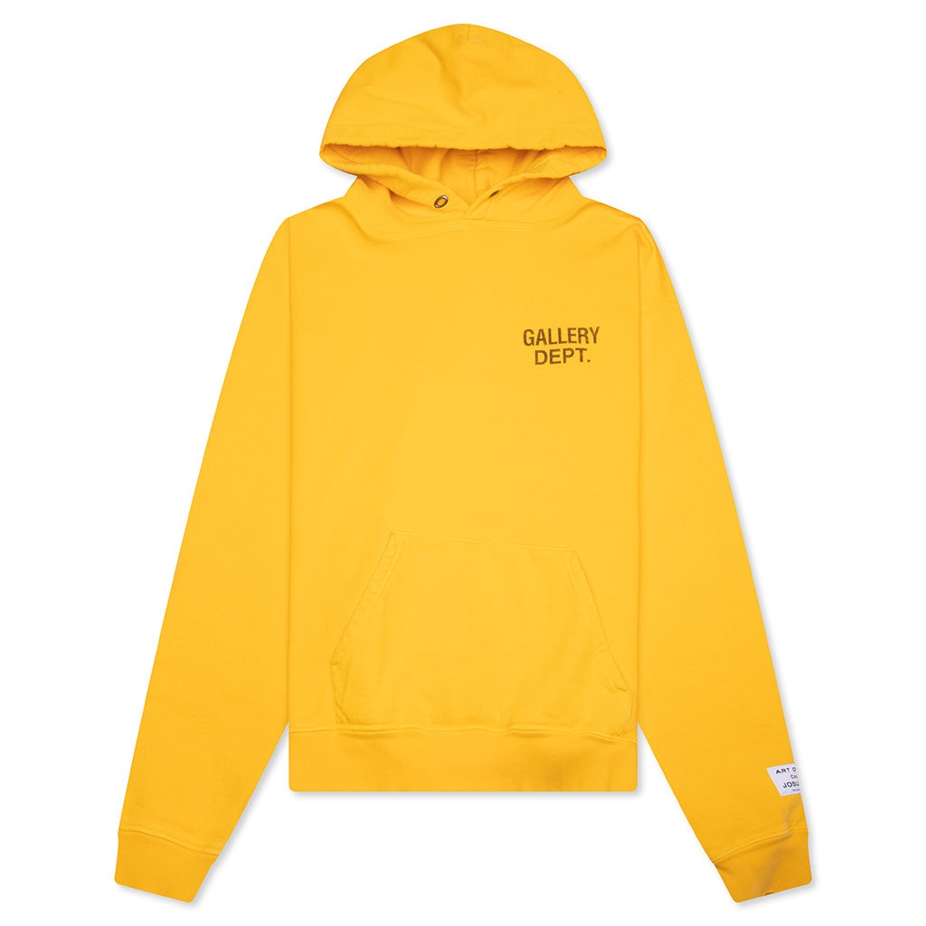 Gallery Dept. The 90's GD Logo Hoodie delivers a bold take on everyday wear. Crafted from 100% loopback cotton-jersey, it offers a soft feel with a durable structure. The oversized fit creates a relaxed silhouette, while the GD ENGLISH logo is printed on the front and back for a signature look. A classic front pocket adds function, and the brand’s 'art on display' patch at the cuff completes the design. Made in the USA. GDLH 50025 GOLD - 100% Cotton - Oversized fit - GD English logotype - Kangaroo pocket - Attached hood - Applique patch - Ribbed trims - Style No: GDLH-50025-GOLD