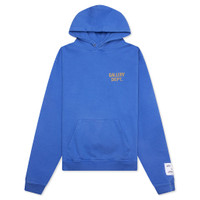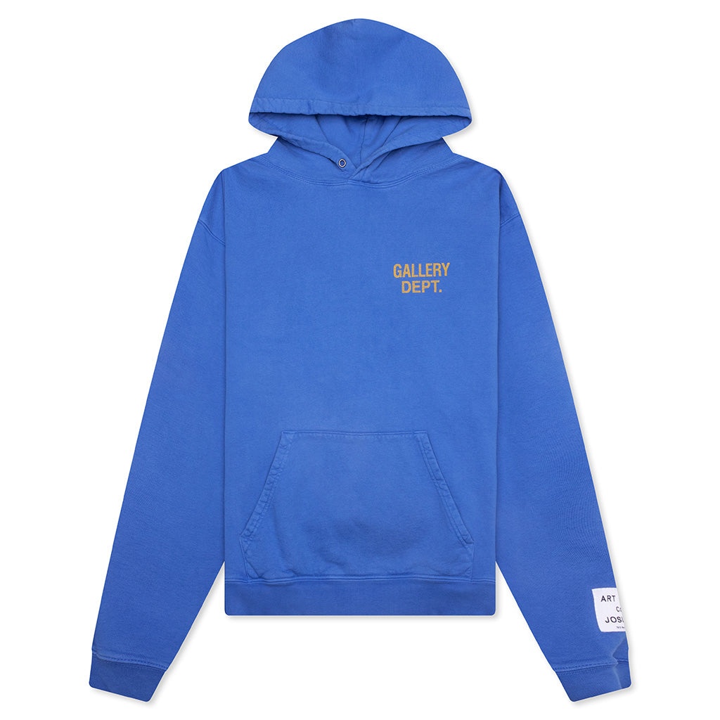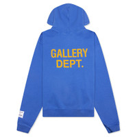 Gallery Dept. The 90's GD Logo Hoodie delivers a bold take on everyday wear. Crafted from 100% loopback cotton-jersey, it offers a soft feel with a durable structure. The oversized fit creates a relaxed silhouette, while the GD ENGLISH logo is printed on the front and back for a signature look. A classic front pocket adds function, and the brand’s 'art on display' patch at the cuff completes the design. Made in the USA. GDLH 50025 ROYA - 100% Cotton - Oversized fit - GD English logotype - Kangaroo pocket - Attached hood - Applique patch - Ribbed trims - Style No: GDLH-50025-ROYL
