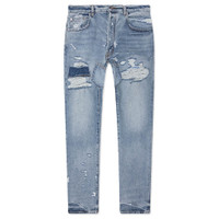 Introducing the Bowery 5001 from Gallery Dept. Constructed from cotton, these jeans are cut to the classic 5001 silhouette with a mid-rise and straight leg fit. Unique distressed details like reinforced rips, darning, and denim patchwork add personality and edge. The piece is completed with a signature leather jacron and faded wash. BWYP 40042 WASH - 100% Cotton - Mid-rise, straight leg - 5-pocket design - Button-fly - Reinforced rips - Darning details - Denim patchwork - Leather Gallery Dept. jacron - Faded wash finish - Style No: BWYP-40042-WIND