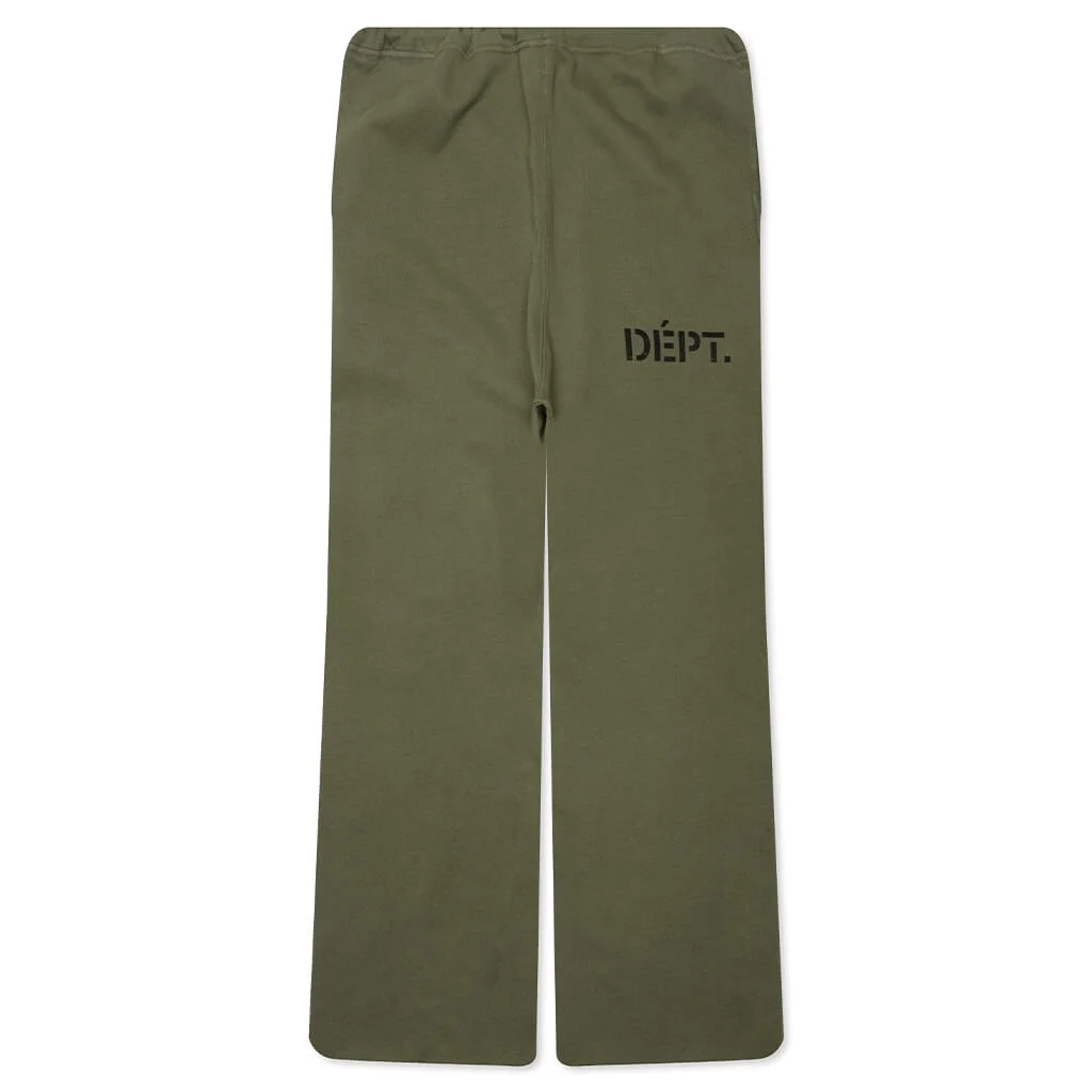 The Gallery Dept. Drop Crotch Sweatpants updates a casual staple with raw details. Made from cotton, the pant is cut to have a relaxed, baggy fit with a wide leg opening for added movement. An elastic waistband with an inner drawstring ensures a secure fit, while side pockets add function. Finished with a subtle 'FRENCH DEPT.' logotype at the front. - 100% Cotton - Relaxed fit - Wide-leg - Elastic waistband - Interior drawstring - Side pockets - Screen-printed logo - Style No: DCS-40108-OLIV