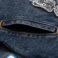 The Midnight Vest from Gallery Dept. is constructed from cotton denim. Designed with a frayed neckline and cuffs, it features a classic button-front closure, dual chest flap pockets, and welt pockets. Woven patch designs and large Gallery Dept. patches on the back make a graphic statement. MV 60069 INDI - 100% Cotton - Frayed neckline and cuffs - Button-front closure - Woven patches - Large Gallery Dept. patches - Dual chest flap pockets - Dual welt pockets - Adjustable button tab at waist - Style No: MV-60069-INDI