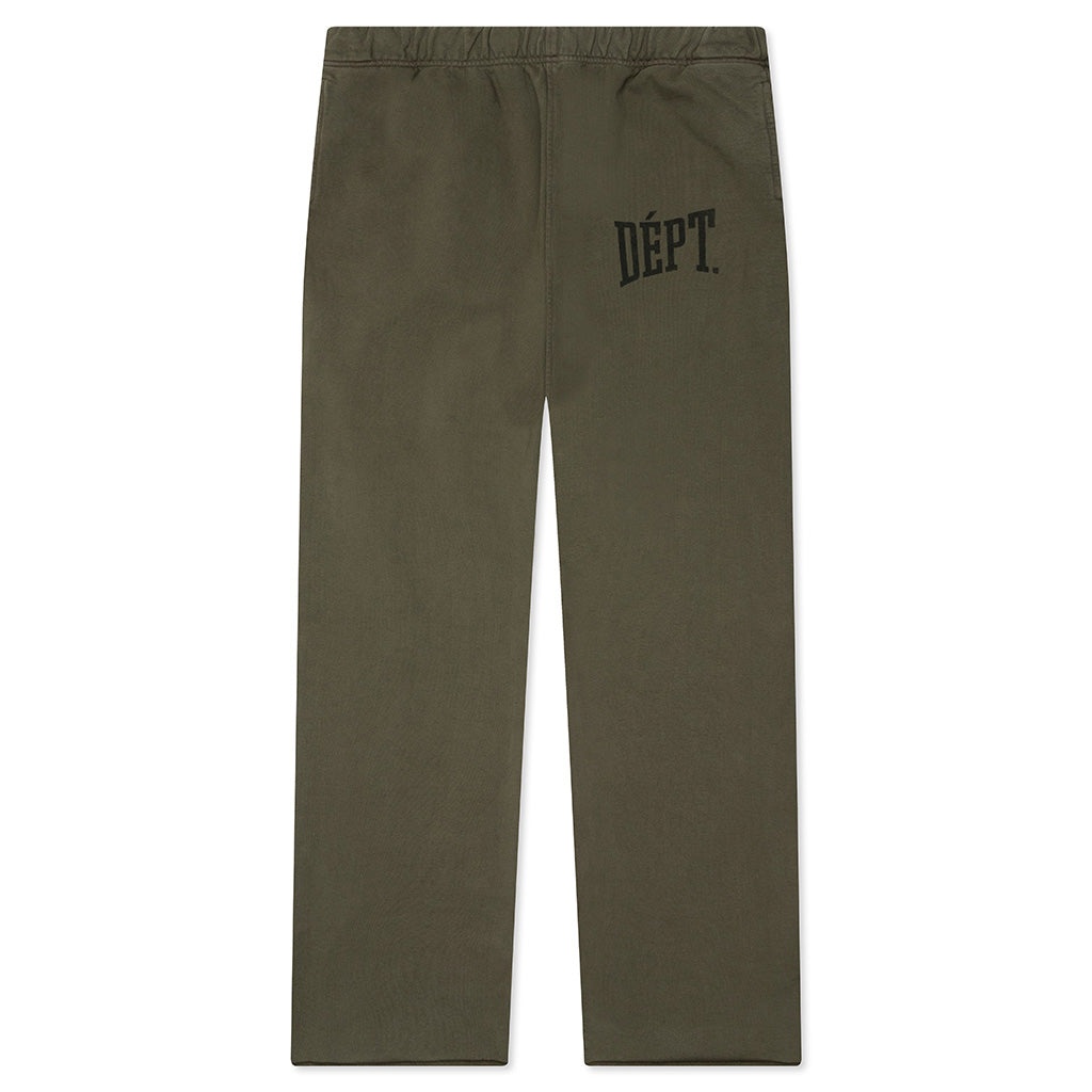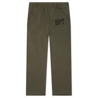 The Gallery Dept. Team Sweatpant blends comfort with bold branding. Cut from 100% fleece cotton, the sweatpant features a loose, straight leg fit for a relaxed feel. An elastic waistband with an inner drawstring ensures a secure fit, while side pockets add function. Finished with a standout FRENCH logotype at the front. Made in the USA. LSP 40080 OLIV - 100% Cotton - Made in USA - Straight leg - Loose fit - Elastic waistband - Interior drawstring - Side pockets - FRENCH logotype - Style No: LSP-40080-OLIV