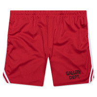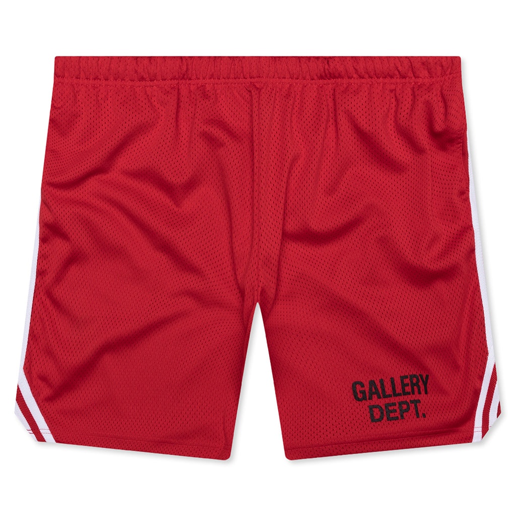 The Gallery Dept. Venice Court Shorts deliver a modern update to a classic athletic silhouette. Made from breathable mesh jersey, they feature a slightly shorter 8.25" inseam for a contemporary fit. The balloon shape offers relaxed comfort, while the elastic waistband with inner drawstring ensures a secure feel. The shorts are finished with front slip pockets, white striped piping, and the GD ENGLISH logotype at the front. They are double-lined for added structure and durability. Made in the USA. VCS 5245 RED - 100% Polyester - Breathable mesh - 8.25" inseam - GD ENGLISH Logotype - Balloon fit - Elastic waistband - Interior drawstring - Side seam pockets - Striped piping - Double-lined - Style No: VCS-5245-RED