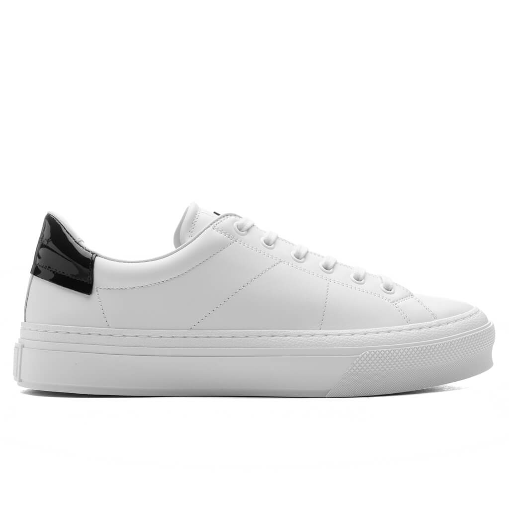 The City Sport Sneakers in Leather in White/Black offer a clean and modern aesthetic. Crafted with a leather upper and classic lace-up closure, these sneakers provide a polished yet casual look. The rubber outsole ensures durability and comfort, while the patent leather heel tab with branding adds a sleek, standout touch. - Leather upper - Lace up closure - Rubber outsole - Patent leather heel tab w/ branding - Style No: BH005VH1RY116
