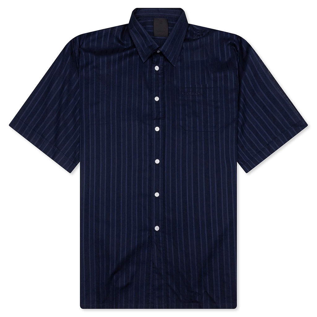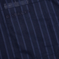 The Givenchy Cotton Voile Shirt With Stripes in Navy is a stylish and versatile addition to your wardrobe. Made from lightweight cotton voile, this short-sleeved shirt features classic stripes for a timeless look. It includes a classic collar, a chest pocket with the small Givenchy signature embroidered, and buttoned closure. The shirt is designed with small slits on the sides and offers a classic fit, making it perfect for various occasions. - Lightweight cotton voile construction - Classic collar - Chest pocket - Embroidered Givenchy signature - Buttoned closure - Classic fit with small side slits - Style no: BM60ZZ1YF7-410