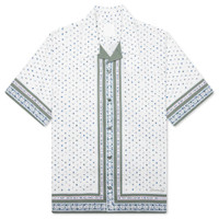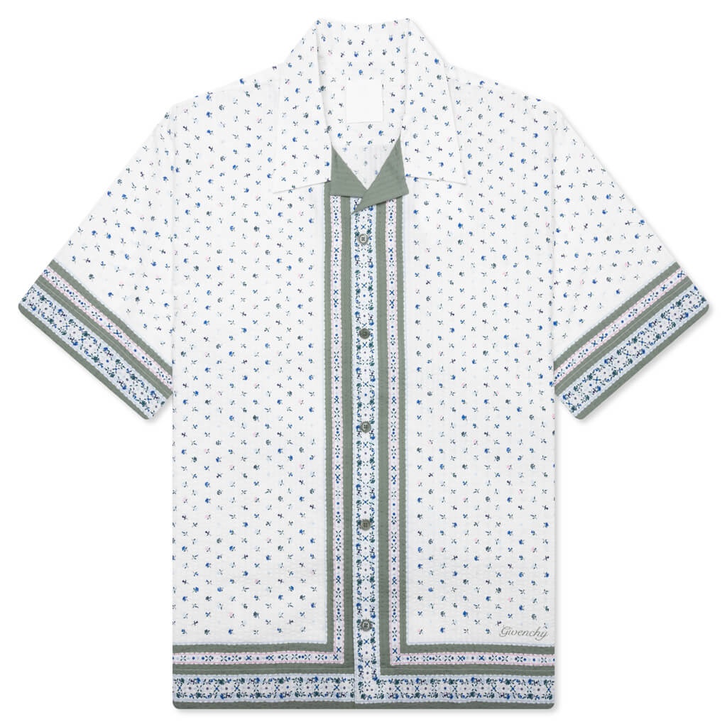 The Boxy Fit Shirt in Cotton Seersucker with Floral Print in Cream/Green combines texture and style for a fresh look. Crafted from cotton seersucker, this shirt features a relaxed Hawaiian collar and a playful polka flower print. A small GIVENCHY signature is printed on the lower front, while the button closure and side slits enhance the shirt's comfortable boxy fit. Perfect for adding a unique touch to your casual wardrobe. - 100% Cotton - Hawaiian collar. - Polka flower print. - Small GIVENCHY signature printed on the lower front. - Button closure. - Small slits on the sides. - Boxy fit - Style No: BM611015N2185