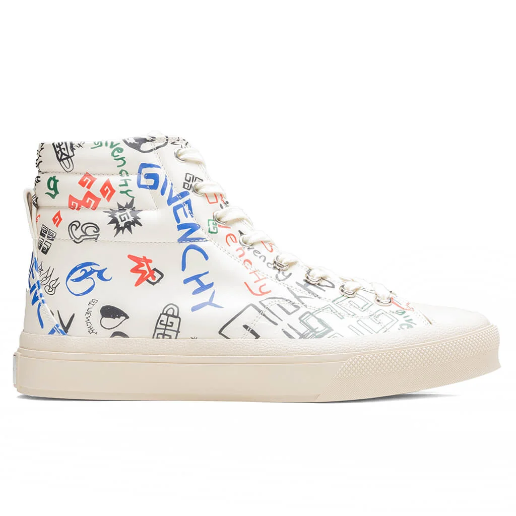 The Givenchy City High Top Sneaker is a premium sneaker for any collection. Featuring a graffiti calfskin leather upper, the silhouette features a high-top construction paired with quilted reinforcements around the ankle. A Givenchy-engraved metal plaque is seen at the heel, while the leather label is debossed with a 4G emblem within the tongue. A rubber outsole underneath finishes the rest of the look. - Calfskin leather upper - Graffiti print - Quilted ankle - Engraved branding - Leather label - Debossed branding - Lambskin leather insole - Rubber outsole - All sizes are listed in European Men’s sizing unless stated otherwise - Style No: BH005LH19F-960