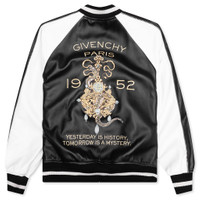 The Givenchy Embroidered Jacket reimagines the varsity silhouette with premium materials and intricate detailing. Crafted from 100% nappa lambskin, the leather construction delivers a refined feel, while the viscose lining ensures smooth comfort. The front features GIVENCHY embroidered writings, while the back showcases elaborate snake and chandelier embroideries, along with GIVENCHY mixed writings, blending heritage-inspired motifs. The ribbed knit collar, cuffs, and hem with contrasting stripes reinforce the jacket’s classic varsity aesthetic. Complete with a snap-button closure and two side pockets, the Givenchy Embroidered Jacket is a statement piece. - 100% Lambskin - Lining: 100% Viscose - Zip closure - Striped ribbed trims - Embroidered branding - Two-tone sleeves - Hand pockets - Style No: BM01886003-004
