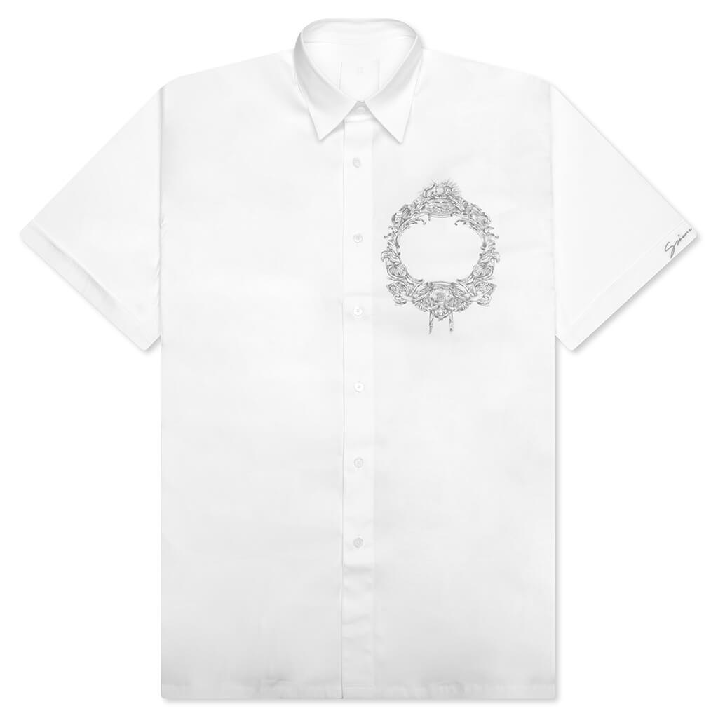 Givenchy makes an impression with the Short Sleeve Military Shirt. Composed of poplin, the silhouette features a classic collar and a Baroque crown print on the chest. Finishing touches include a full button closure and side slits for an elevated look. - 100% Poplin - Classic collar - Baroque crown at the chest - Button closure - Side slits - Style No: BM612B1YH5-100