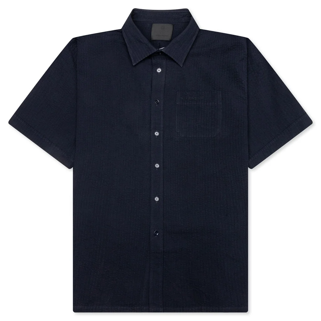 The Short Sleeve Shirt with Pocket in Night Blue offers a refined yet casual look. Crafted from cotton, this short-sleeved shirt features a classic collar and a button closure for timeless appeal. The chest pocket is accented with an embroidered GIVENCHY signature, adding a subtle touch of branding. With a classic fit, this shirt is a versatile choice for any occasion. - 100% Cotton - Classic collar - One chest pocket with embroidered GIVENCHY signature - Button closure - Classic fit - Style No: BM60ZZ15MN403