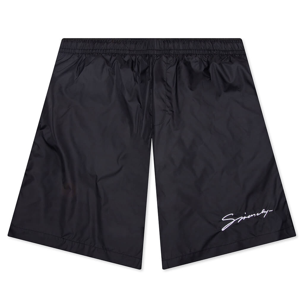 Crafted from 100% recycled polyamide, the Givenchy Logo Embroidery Swim Shorts are lightweight and offer a sleek feel. Designed for effortless wear, the elastic waistband ensures a comfortable fit, while two side pockets and a back pocket provide functional storage. A small GIVENCHY signature embroidery on the left leg adds a subtle yet sophisticated touch, reinforcing the brand’s timeless aesthetic. - 100% Polyamide - Elastic waistband - Recycled fabric - Embroidered branding - Side-seam pockets - Back welt pocket - Style No: BMA01L1537-004