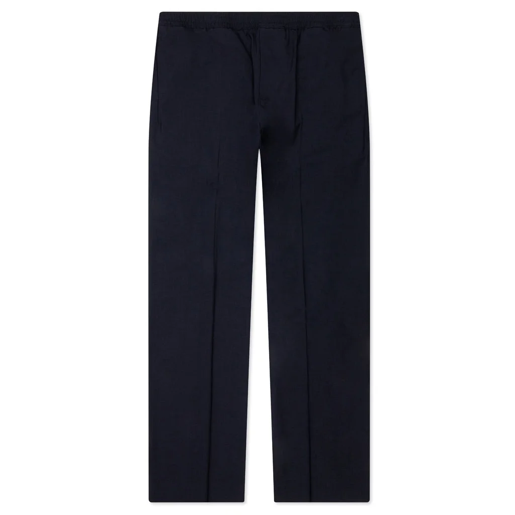 The Slim Fit Formal Wool and Mohair Pants in Night Blue combines formal trousers with the comfort of joggers. Crafted from a wool, nylon, and elastane blend, these joggers feature formal detailing, including a creased front and straight legs. An elasticized waistband offers ease of wear, while side seam pockets and back welt pockets provide functionality. - Wool/nylon/elastane - Formal trouser detailing - Elasticized waistband - Creased front - Side seam pocket - Back welt pockets - Straight legs - Style No: BM51DG14PY403