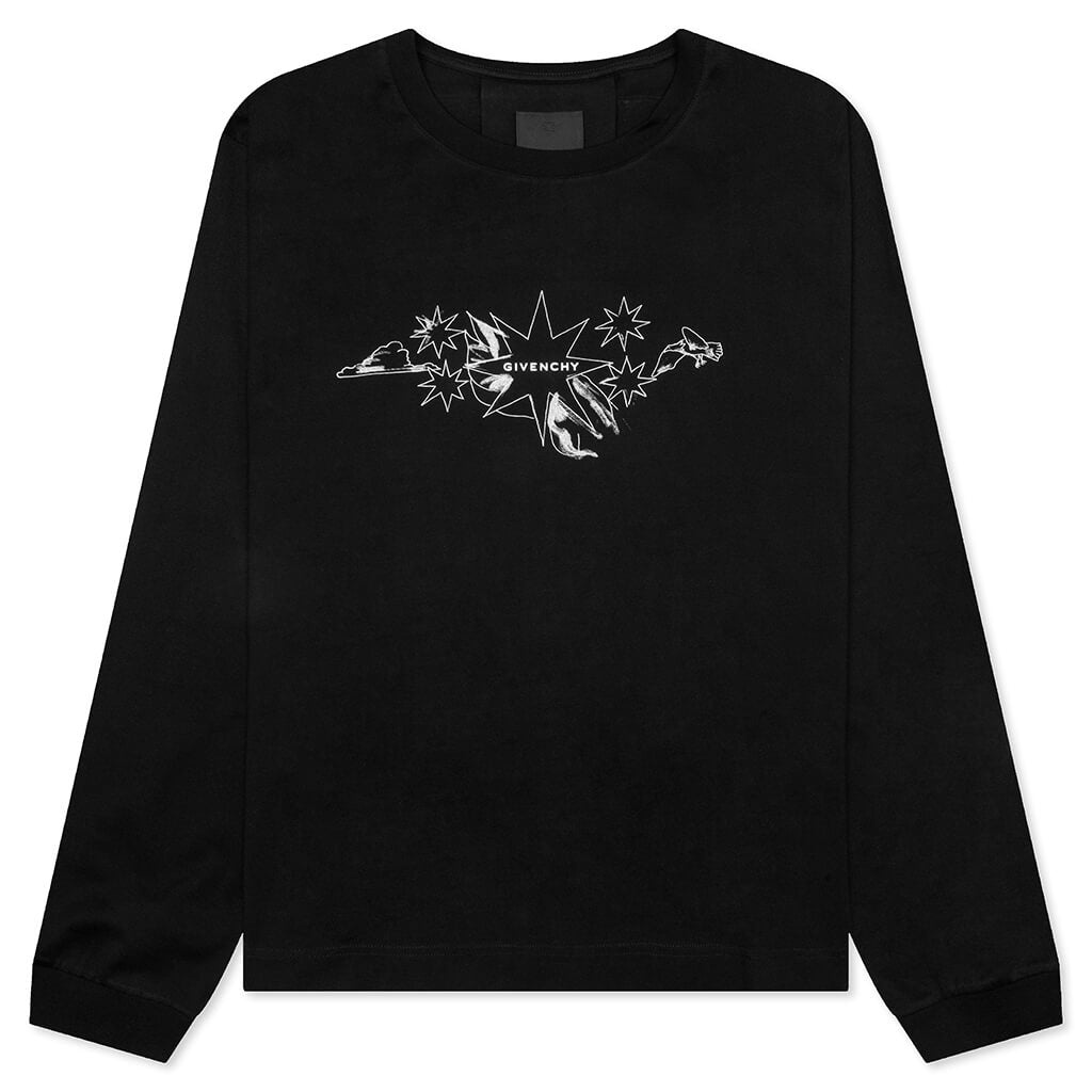 The Tarot Print Boxy Fit Long Sleeve T-Shirt in Black offers a relaxed yet stylish look. Crafted from cotton, this long-sleeved t-shirt features a classic crew neck and a small GIVENCHY signature printed on the front. A bold tarot print adorns both the front and back, adding a unique graphic element. The boxy fit enhances its laid-back silhouette. - 100% Cotton - Crew neck - Small GIVENCHY signature printed on the front - Tarot print on the front and back - Boxy fit - Style No: BM71KP3YN0001