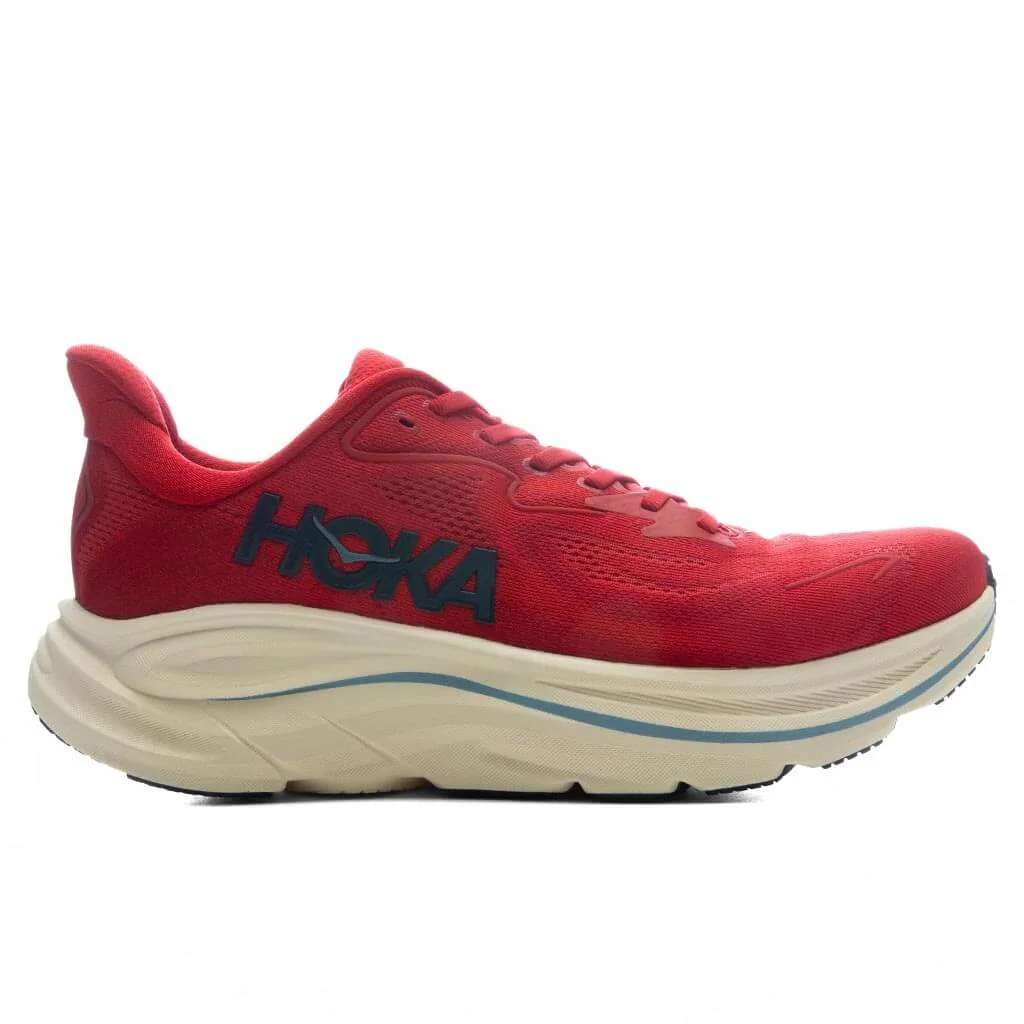 HOKA is a French-founded footwear brand renowned for its distinctive cushioned designs that make running smoother. Celebrating a decade of innovation, the HOKA Clifton 10 continues its legacy as a trusted trainer for everyday miles. Lightweight yet incredibly cushioned, this latest iteration with reimagined features keeps the Clifton a fan favorite. Introducing a revitalized underfoot experience, the Clifton 10 is engineered with an additional 3mm in heel-to-toe drop providing softer cushioning. The shoe features a breathable jacquard knit upper and a compression-molded EVA midsole. With a rearfoot Active Foot Frame™ for added stability, an abrasion-resistant rubber outsole for long-lasting traction, and an enhanced lace system to keep the tongue in place. - Brand/Model: HOKA Clifton 10 - Colorway: Vibrant Vermillion and Varsity Navy color - Category: Perfect Neutral Daily Trainer - Upper: Breathable jacquard knit upper - Cushioning: Lightweight and ultra-cushioned with increased stack height - Midsole: Compression-molded EVA foam midsole, supported with Rearfoot Active Foot Frame™ - Outsole: Durable abrasion rubber outsole - Closure: Double-lock lace - APMA Seal of Acceptance for foot health support - Sizing: All sizes are listed in U.S. Women's sizing unless stated otherwise - Style Code: 1162030-VLLN