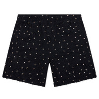 Step in style with the Beaded Shorts from Honor the Gift. Cut to have a relaxed fit, the shorts are constructed from polyester that is adorned with beaded details. Functional details include an elastic waistband, side-seam pockets, and dual back pockets. Completing the ensemble is a woven brand patch with beaded details for additional shine. HTG250320 BLAC - 100% Polyester - Relaxed fit - 7" inseam - Beaded applique - Elastic waistband - Side-seam pockets - Dual back pockets - Woven brand patch - Frayed hems - Style No: HTG250320-BLK