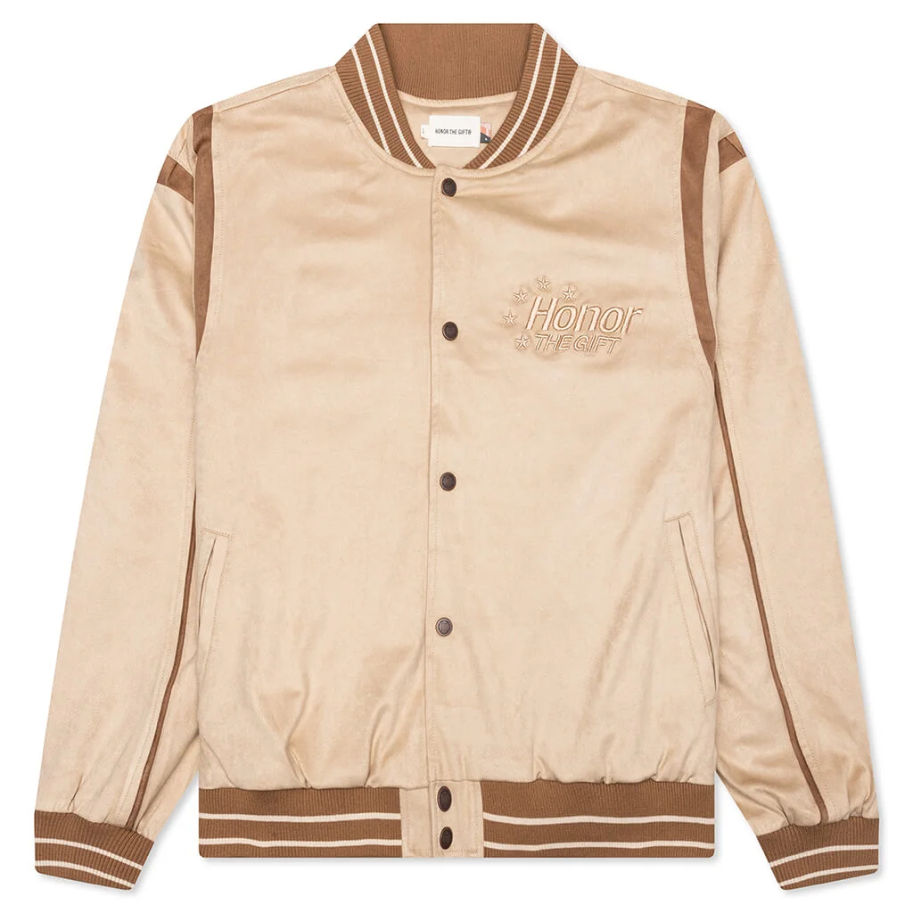 The Oil Head Varsity is the latest addition from Honor The Gift. Composed of soft peached polyester, this jacket features a button closure at the front, ribbed elastic trims, and side pockets for storage. The look is highlighted by the tonal chenille Oil head graphic at the back, with additional embroidery at the chest. Custom ribbing and contrast piping are some finishing touches to the design. HTG250163 TAN - 90% Polyester/10% Spandex - Peached texture - Varsity silhouette - Button-up closure - Chenille graphic - Embroidered graphics - Ribbed trims - Contrast piping - Style No: HTG250163-TAN