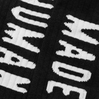 The HM Logo Socks are crafted from a blend of cotton, acrylic, polyester, nylon, and spandex. Designed to have a mid-length fit, the socks feature a padded footbed and ribbed design, offering additional comfort and cushioning. The Human Made logo is showcased down the side of the socks in a jacquard weave giving it a soft feel. - 55% Cotton, 24% Acrylic, 14% Polyester, 5% Nylon, 2% Spandex - Mid-length - Ribbed design - Jacquard weave logo - Padded footbed - Style No: HM30GD066-BLK