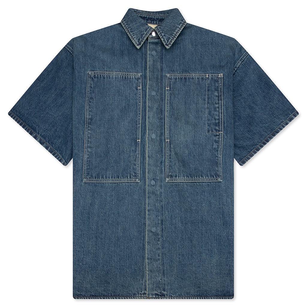 The Washed and Bleached Raw Denim Shirt by Jil Sander is composed of 100% cotton denim and has a regular fit. This style has been washed and bleached for a more worn-in look. The garment has short sleeves and features elongated patch pockets for a unique look. A snap button closure is placed under the hidden placket, paired with a classic collar. This look has an oversized fit with dropped shoulders for a more casual feel. - 100% Cotton denim - Made in Japan - Oversized fit - Dropped shoulders - Classic collar - Snap button closure - Hidden placket - Elongated pockets - Rounded hem - Leather patch - Style No: J47DL0168-J45291-420