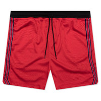 The John Elliott Sigma Shorts in Red are crafted from hoops-inspired mesh fabric, offering a relaxed and slightly cropped fit for a sporty look. They feature two-pocket styling, a ribbed drawstring waist, and double-taped side trim with vented cuffs. Fully lined and made from 100% polyester. - 100% Polyester - Two-pocket styling - Ribbed drawstring waist - Double-taped side trim - Style no: C66M2360A