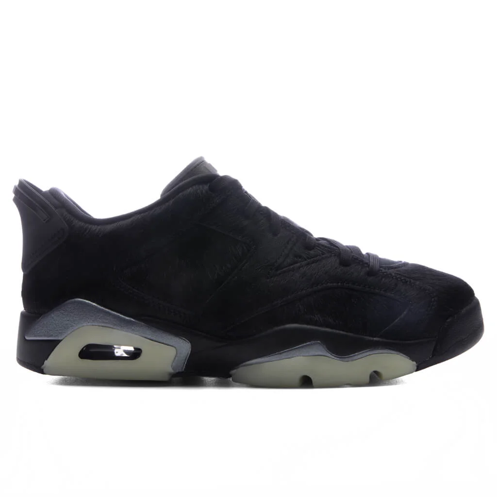 The Women's Air Jordan 6 Retro Low 'Blackout' enters the scene with a subtle yet luxury look. The upper is covered in pony hair to have a elegant tone and feel. Dark grey accents appear on the midsole to have contrast. Including a full lace closure, rubberized tongue, and pull loop heel tabs. Jordan branding details brings a retro feel. The visible Air-Sole unit allows comfort, while the rubber outsole offers traction and finishes the silhouette. DUE TO THE NATURE OF THIS PRODUCT, ALL SALES ARE FINAL. THIS PRODUCT DOES NOT QUALIFY FOR DISCOUNTS OR SPECIAL PROMOTIONS. - Pony hair upper - Full lace closure - Dark Grey accents - Rubberized tongue - Pull loop heel tabs - Jordan branding details - Visible Air-Sole unit - Rubber outsole - All sizes are listed in U.S. Women's sizing unless stated otherwise - Style no: IO9786-001