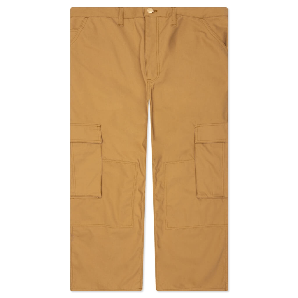 The Junya Watanabe MAN x Carhartt WIP cargo pants in brown are crafted from a durable polyester and cotton blend. Featuring belt loops, five-pocket styling, and a zip-fly for a practical touch, these pants also include knee panels, cargo pockets, and a hammer loop for added functionality. A logo patch on the back signifies the collaboration. Made in Japan, these pants blend utility with refined style. - 65% Polyester, 35% Cotton - Belt loops, five-pocket styling - Zip-fly, knee panels - Cargo and hammer loop - Logo patch - Made in Japan - Style No: WM-P019-051-2