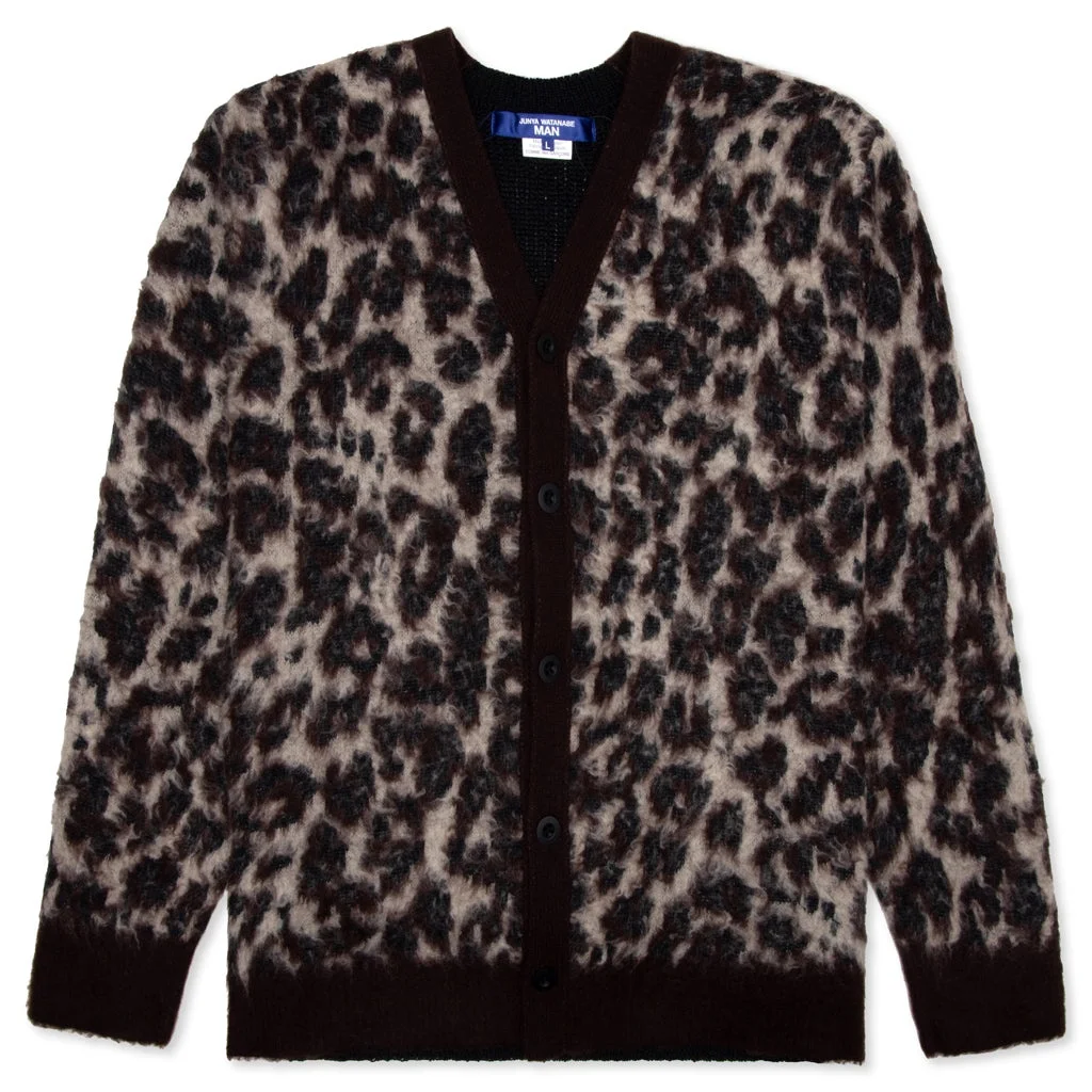 The Junya Watanabe MAN Leopard Cardigan in brown features a striking leopard jacquard pattern. This cardigan has a V-neck and button closure, with dropped shoulders for a relaxed fit. The ribbed hem and cuffs add a touch of classic style. Made in Japan, it's crafted from a blend of acrylic, cotton, nylon, and wool for comfort and durability. - 50% Acrylic, 35% Cotton, 10% Nylon, 5% Wool - Leopard jacquard pattern - V-neck with button closure - Dropped shoulders - Ribbed hem and cuffs - Made in Japan - Style No: WM-N006-051-1