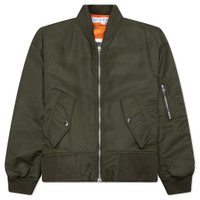 The Oversizes Curved Hem Bomber Jacket from JW Anderson makes an impression in any collection. Composed of nylon, this garment has a curved hem with tonal panelling and a dropped shoulder. A full zip closure, side flap pockets, and a sleeve zipper add a functional touch. The embossed leather patch on the center back completes the look. - 100% Nylon - Zip closure - Bomber jacket - Side flap pockets - Zipper sleeve pocket - Ribbes trims - Embossed leather patch - Style No: JK0357-PG1696-595