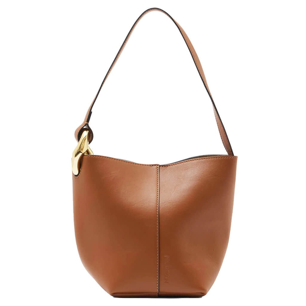 Luxury brand JW Anderson introduces the The JWA Corner Small Bucket. The design is composed of 100% full grain calf leather and has a top handle with the signature JWA gold chain link. With a large tote-style opening, a button secures the bag together, while the subtle embossed branding completes the look. - Body: 100% Full grain calf leather - Lining: 100% Split calf suede - Hardware: 90% Abs/10% Zamak - Made in Hungary - Top handle strap - Button opening - Dimensions: L: 15cm x D: 14cm x H: 20cm - Style No: HB0708-LA0351-640